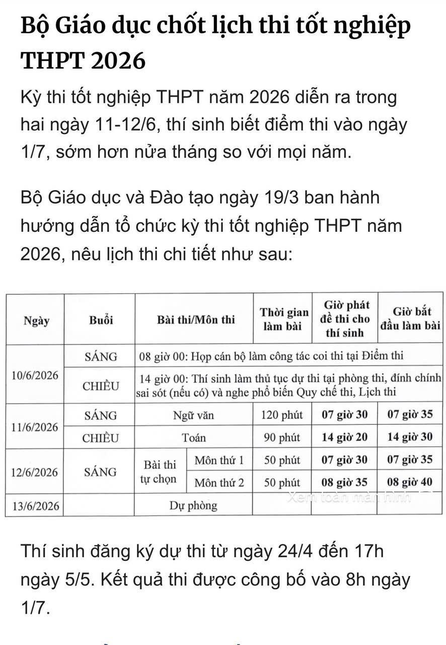 Lịch thi tốt nghiệp năm 2026